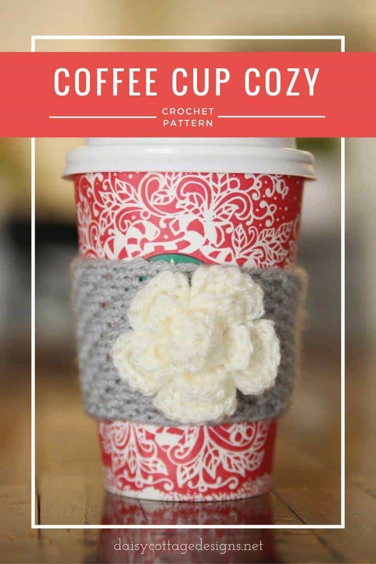 This flower coffee cozy crochet pattern is the newest crochet pattern from Daisy Cottage Designs. As you may have noticed, I haven’t posted many new crochet patterns in the past year. We had a crazy (don’t worry – in a good way) year and there simply wasn’t much time for creating patterns. I’m thankful for the quiet time I had this morning to sit down and whip this up. It was quick and I know it’ll make a great stocking stuffer this holiday season.