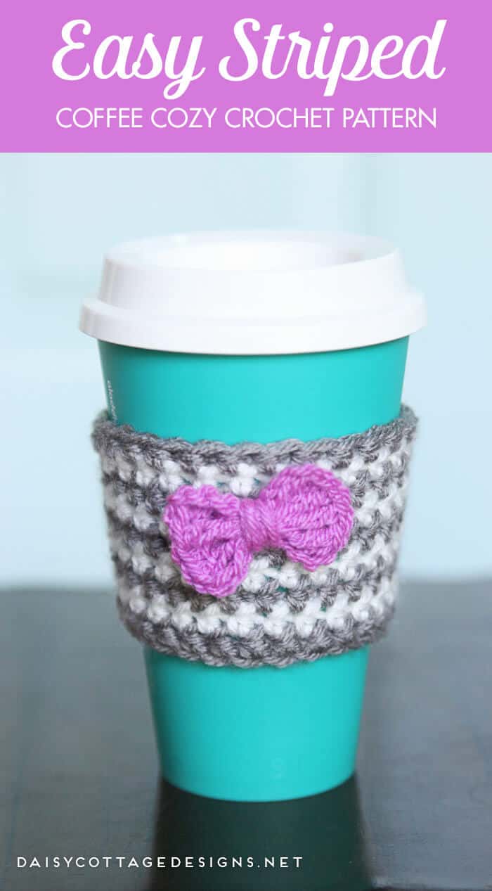 If you’d like to do that, you can use this easy bow crochet pattern. Leave a long tail and sew it right to your coffee cozy.