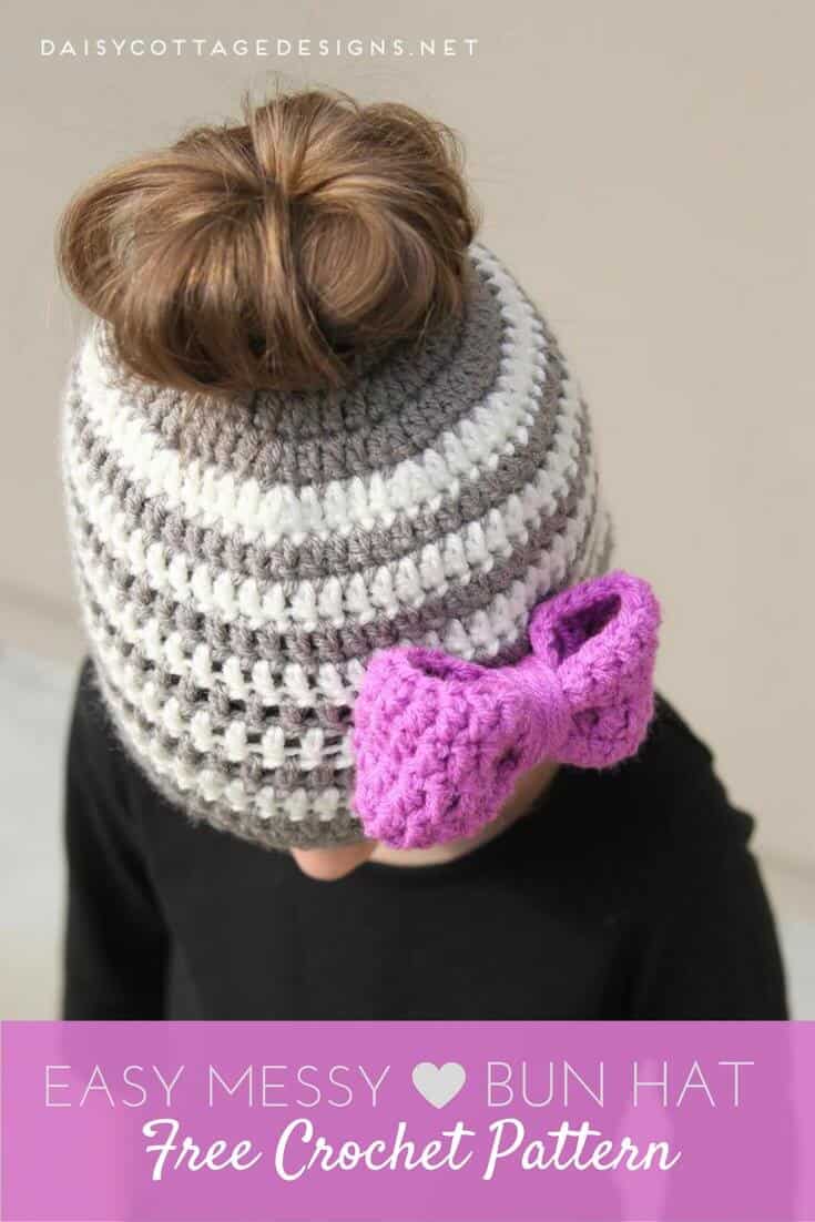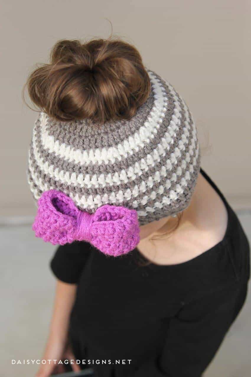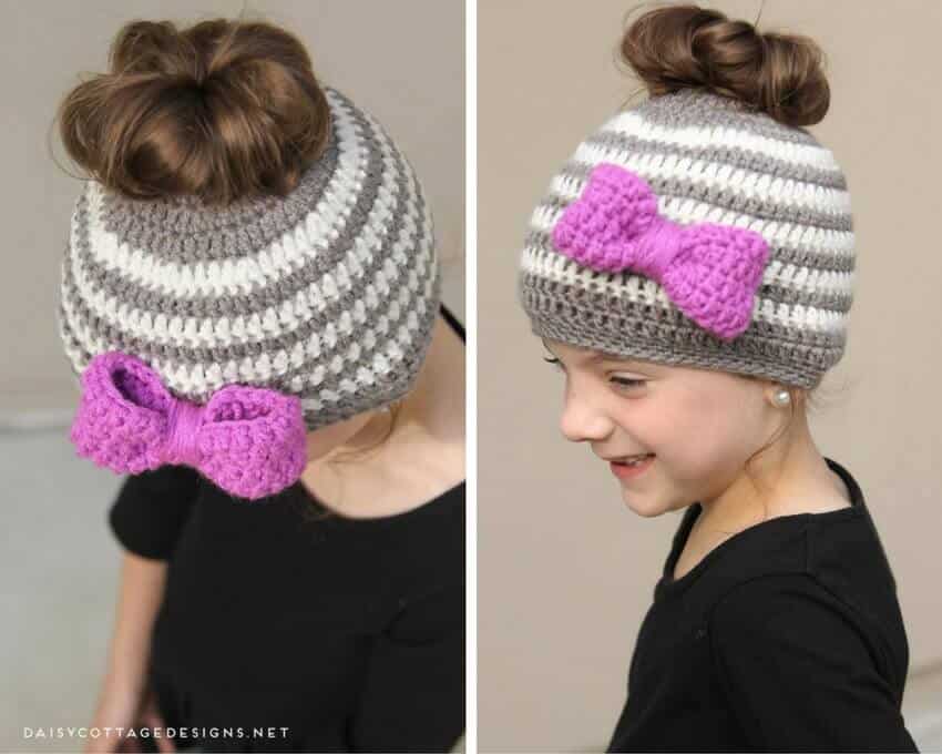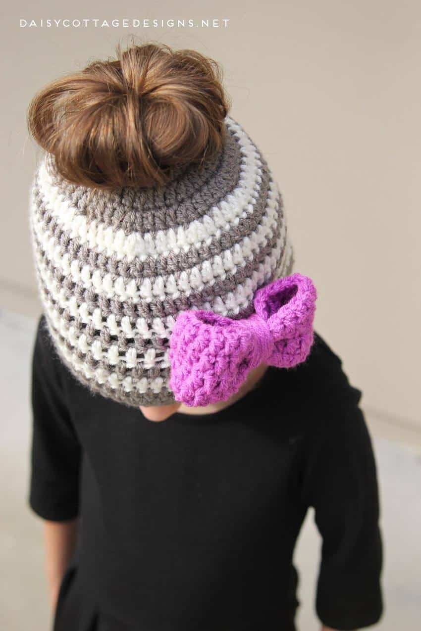 After she saw my messy bun hat, my 6 year old wanted in on the action. Not only that, but many people have asked for a smaller size for kids. So, here it is! If you haven’t seen it, check out the adult messy bun hat pattern before you go.