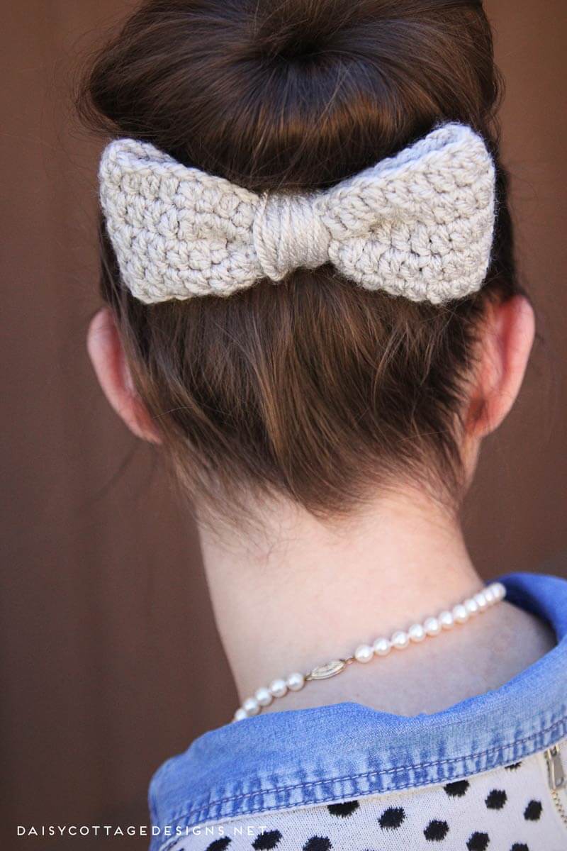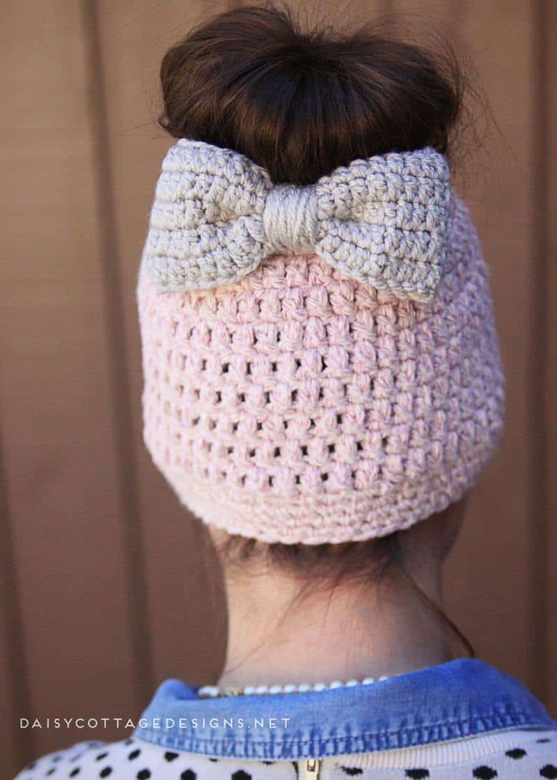 The embellishment is a free crochet pattern, as well! I used the large version of this crochet bow pattern to embellish this messy bun crochet hat. Attach it to an alligator clip and wear it alone or with the hat!